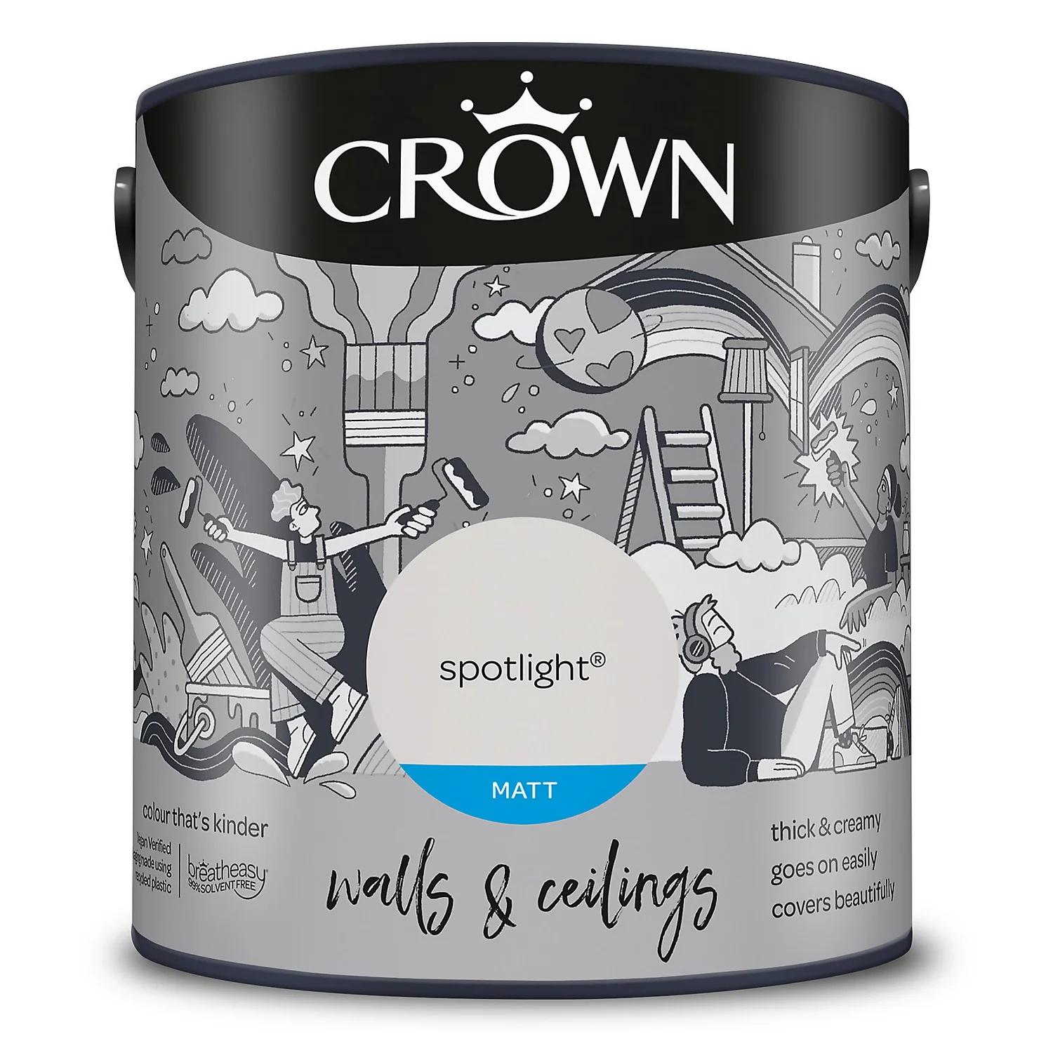 Spotlight – A Beautiful Light Grey Paint with Lilac Undertones. One of 80 colours available in this size, Spotlight is a unique shade of light grey paint that provides a warm and inviting finish to any room setting. Instantly add a touch of warmth to any space, and to any room, with this beautiful light grey paint. don’t be fooled by the name, this colour has distinct lilac undertones. A light grey colour in essence but with a very definite hint of pale mauve, that creates a shade which is warm and inviting. Use in south facing rooms to accentuate this feel. – Crown Colour Specialist.