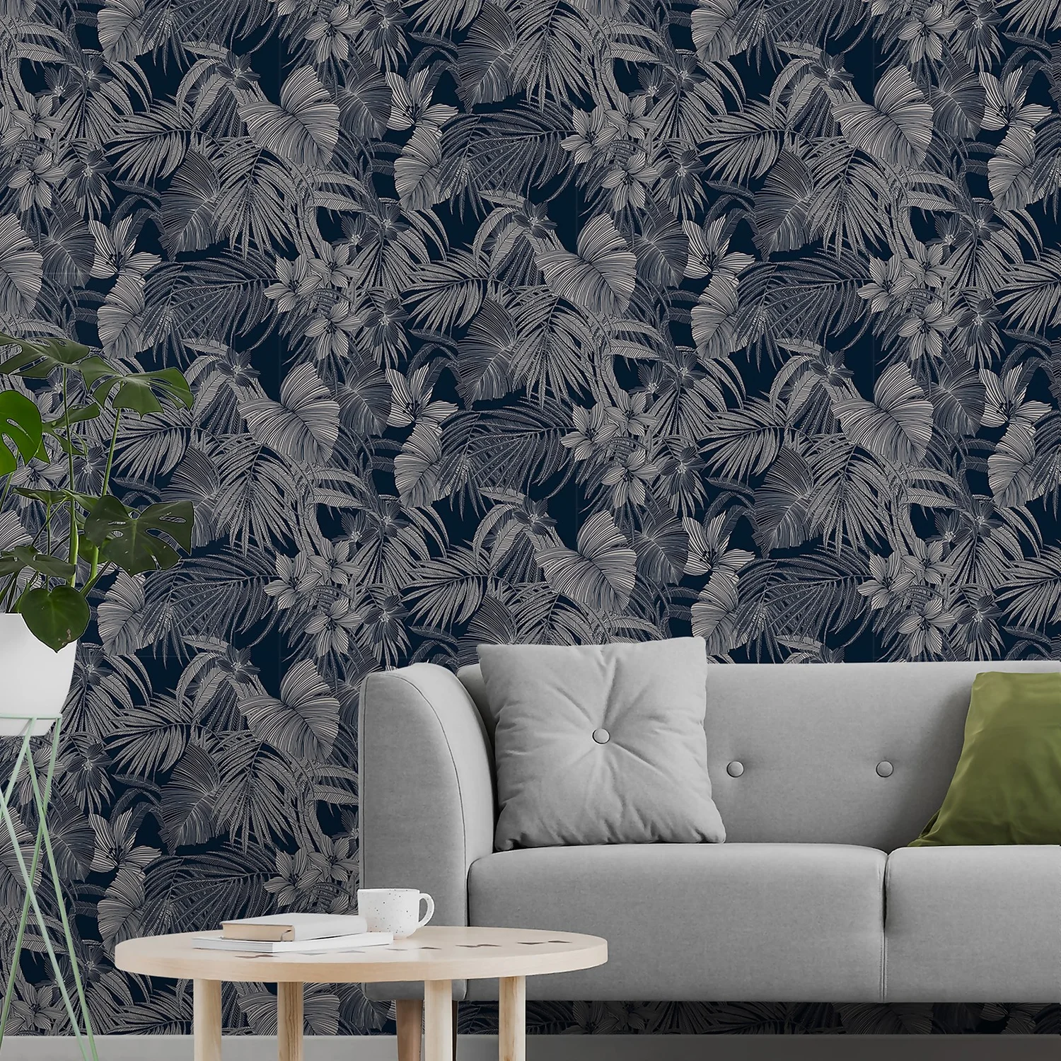 Joelle Navy is the perfect wallpaper to add drama and luxury to your room. The bold navy background lifts the shiny silver tropical leaves and flowers created in fine linework. Use as a feature wall or use this on all four walls to get the most out of this deep, striking product.