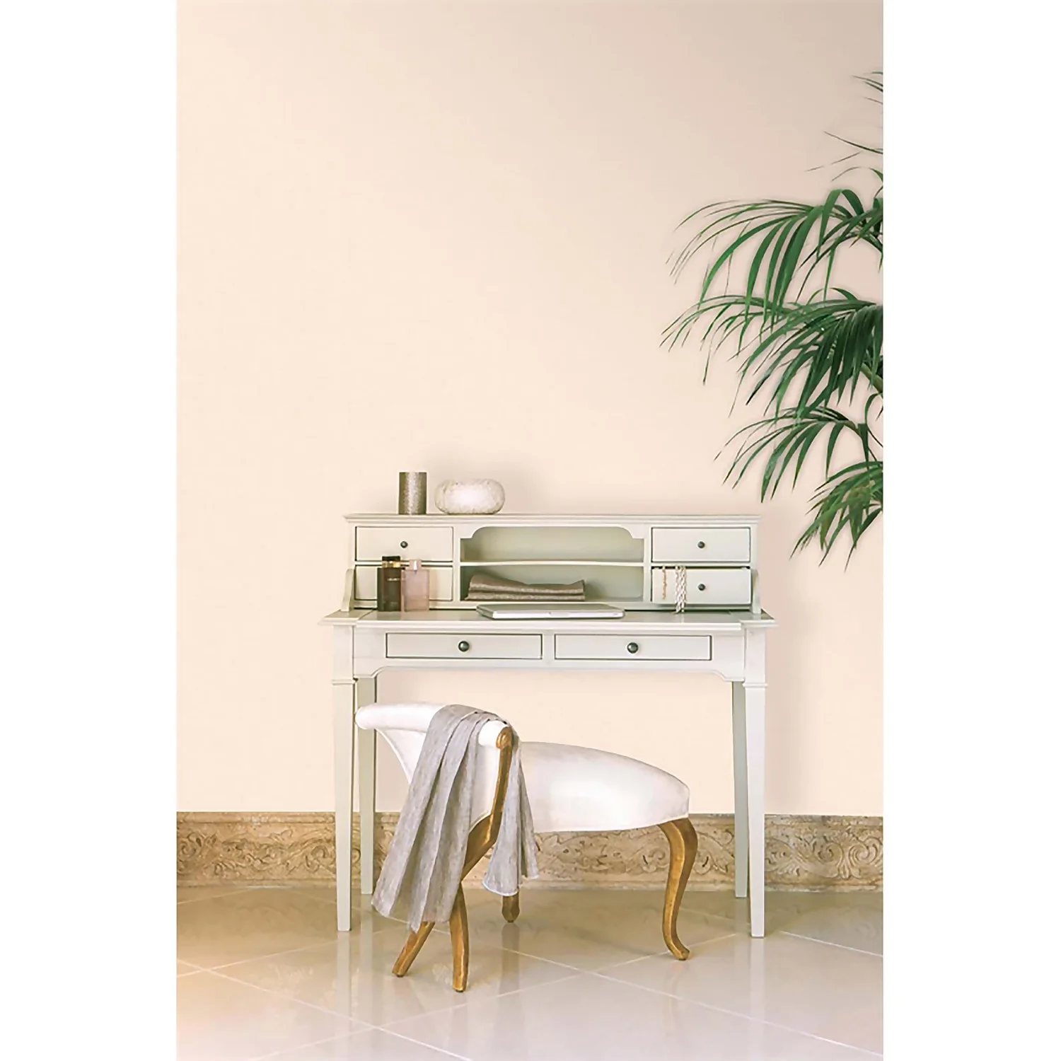 A soft plain linen textured wallpaper and on trend colour pallett.