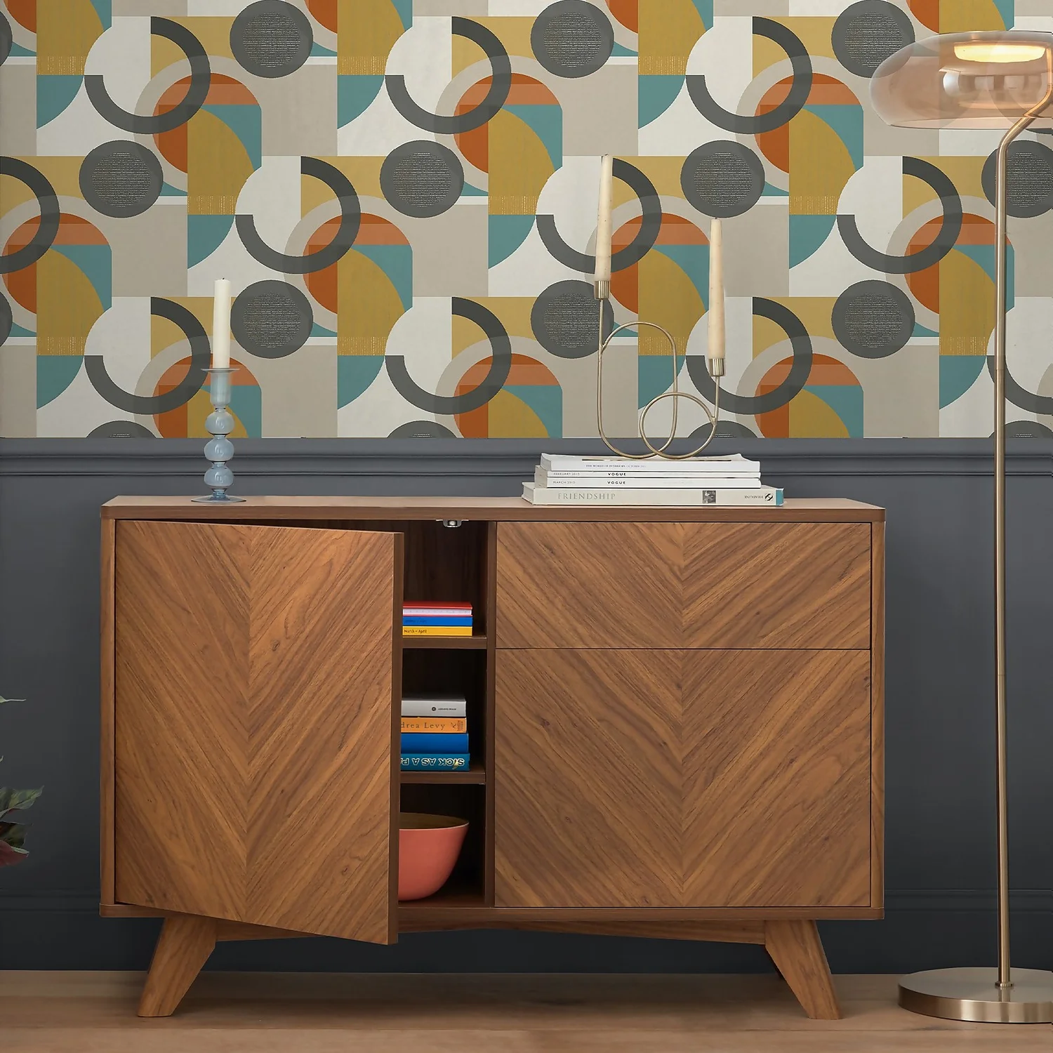 Retro Geo Shapes is a fun and funky way to brighten your walls. This contemporary geometric wallpaper design has an equally modern colour palette intertwining shades of warming neutrals with pops of teal, yellow and orange for a statement look. Printed on a matt paper this design has a contemporary finish whilst also being paste the wall making this wallpaper easy to hang.