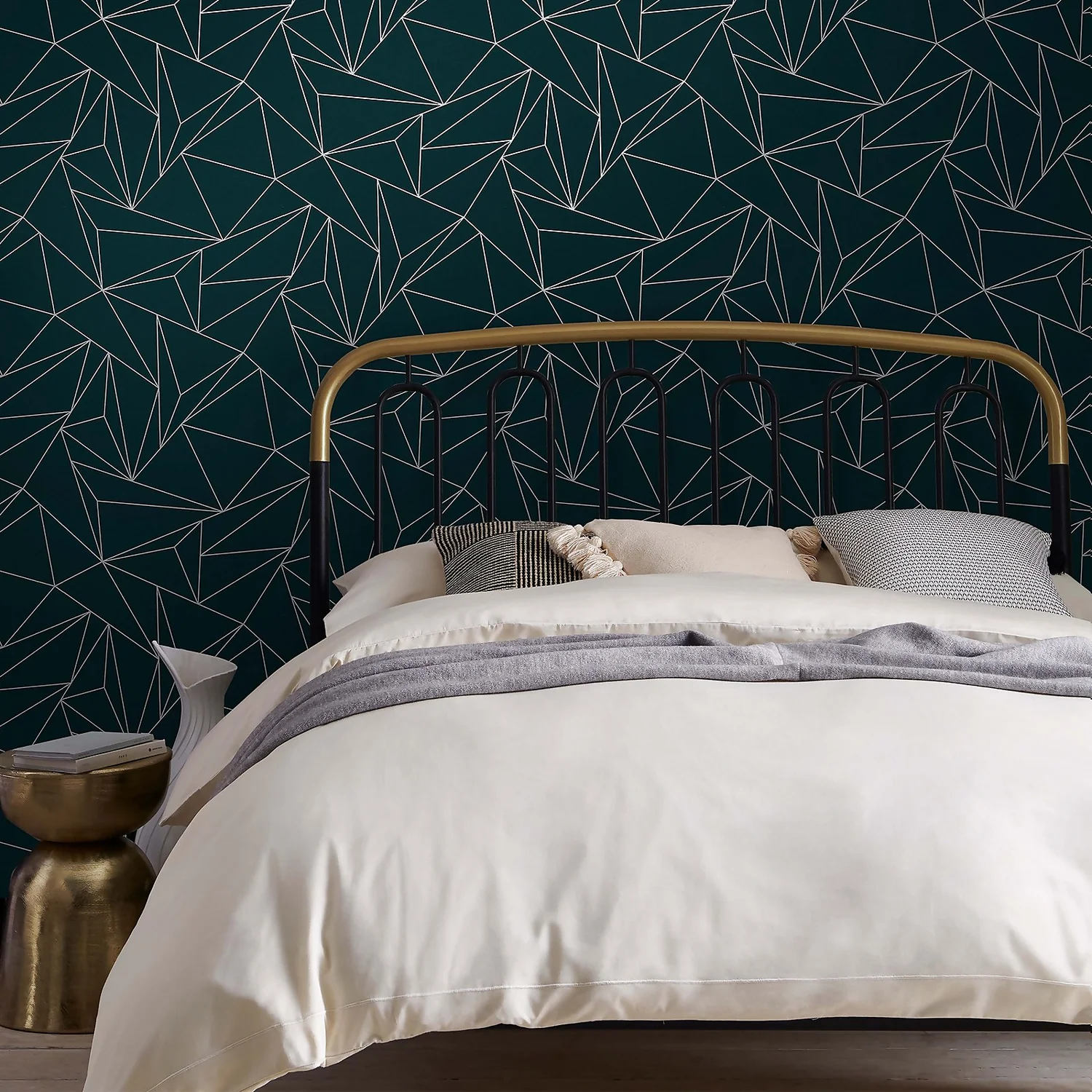 Scatter geo is a beautiful contemporary geometric wallpaper design. This eye-catching design features scattered soft gold metallic lines which come together to create a modern geometric pattern on a stunning teal background. Adding even more luxury, this statement design is printed on a fibrous paper which adds subtle texture whilst also being paste the wall meaning easy to hang.